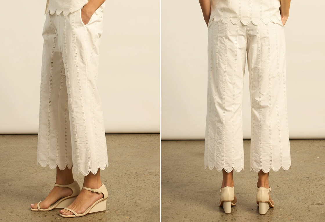 crafted in 100% cotton poplin, the harbour pant is elevated with custom ladder-lace embroidery that flows into a scalloped cropped hem. a neat, flat waistband creates a clean and tailored fit, balancing femininity with structure. designed for versatility, it pairs seamlessly with the pier top for a french-inspired set that feels timeless and modern.