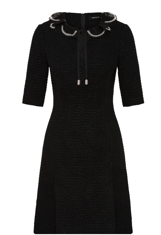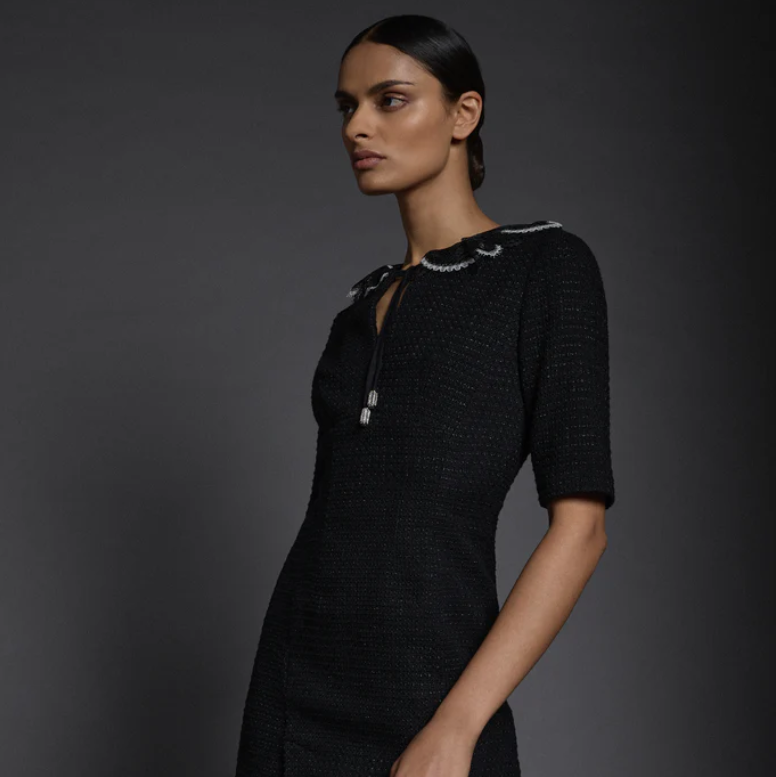The perfect LBD, the Luna Dress is crafted from an Italian stretch tweed fabrication in a cotton viscose blend. Fitted through the body with panelling and an under-bust seam falling to pleat splits at the hem for ease of movement. Features a v-neckline with silver diamante tie toggles on a cotton draw string and a lace collar for added detail. This tailored dress is fully lined with elbow length sleeves. The Luna Dress is a timeless refined style and will leave an impression at any day or night event.