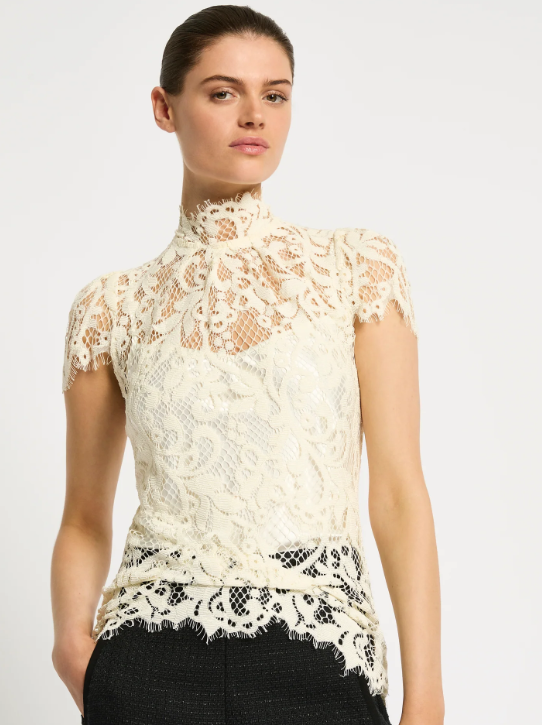 The Chantel Cap Sleeve Top is crafted from a corded, textured lace. Features a high scalloped neckline, cap sleeves and soft tie openings down centre back. This relaxed but structured top can be tucked in or worn loose. Comes with a matching jersey cami. Pair with the Luna Short or Rachel Pant for a sophisticated spring look.